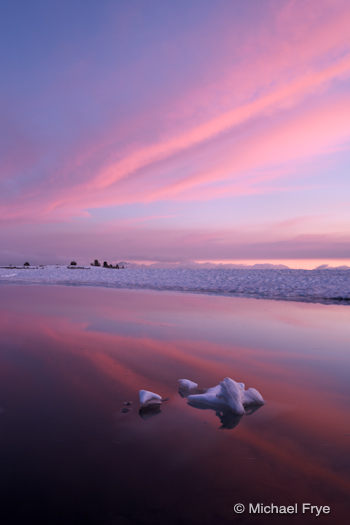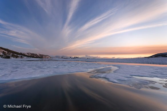Friday evening we climbed up to Gaylor Lakes, and found the middle lake still about eighty-percent ice-covered. While this prevented us from making classic reflection images from this spot, it gave us something perhaps better—the opportunity to photograph ice formations. Somehow hazy sunshine turned into a spectacular sunset, with that ice providing a great foreground.