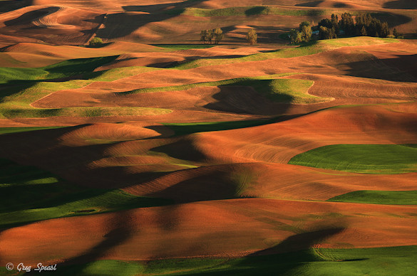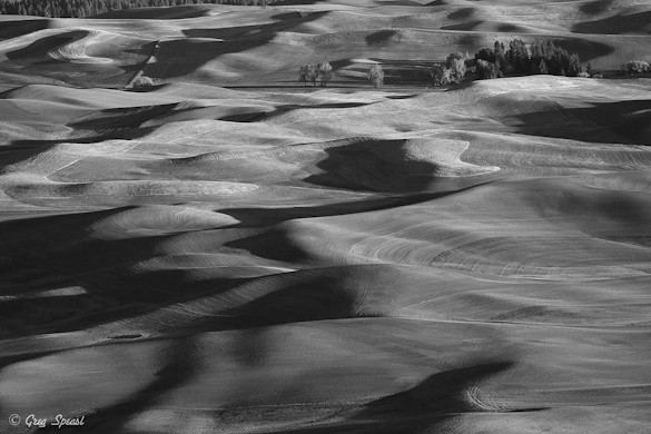 Overall I think this is very well done. The low-angle sidelight is beautiful, and complements the scene perfectly. Best of all, Greg used the space-flattening qualities of a telephoto lens create a great pattern out of the curves and folds of this classic Palouse-country scene.