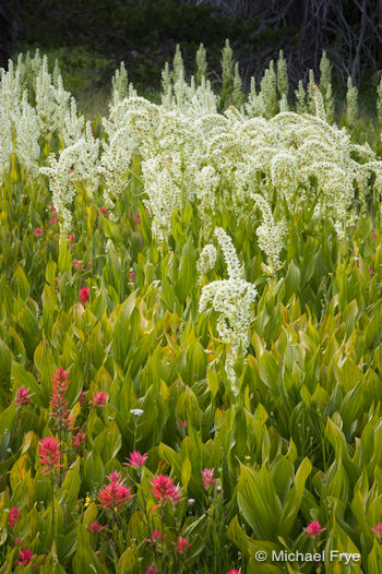 A heavy winter, wet spring, and late snowmelt have all conspired to delay the wildflower bloom in the Yosemite high country, but it’s now in full swing. It’s a fantastic year for corn lilies—those plants with the sculpted, photogenic leaves and tall stalks of white blossoms. The Crane Flat Meadows are full of them, more than I’ve ever seen before, but these flowers are abundant in all the meadows between 6000 and 8000 feet right now. I made the accompanying photos in McGurk Meadow, where I found a nice mix of corn lilies and paintbrush.