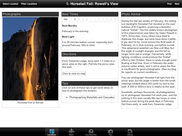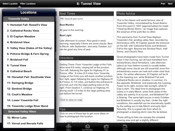 The Photographer’s Guide to Yosemite is now a universal app, built for both iPhone and iPad. The new iPad version takes advantage of the bigger screen to give you easier access to all the information.