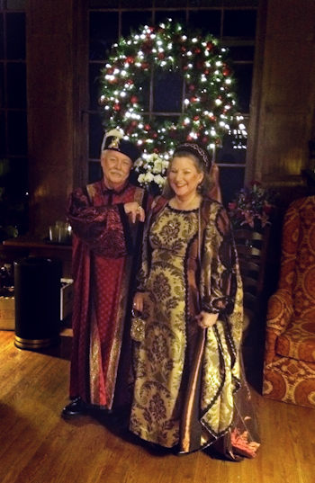 The story, loosely based on Washington Irving’s sketchbook “A Christmas at Bracebridge Hall,” is that you are Christmas dinner guests of Squire and Lady Bracebridge in their medieval English manor. Our good friends Mike Osborne and Linda Eade were invited to be the “Visiting Squire and Lady,” which means they got dressed in costume and sat on stage with the actors who played Squire Bracebridge and his family. Some of you have met Mike during one of the many workshops he’s assisted for me, and I thought you might get a kick out of seeing him and Linda in costume, so here’s an iPhone snapshot of them before the dinner. And even if you don’t know Mike or Linda, I hope this puts a smile on your face!