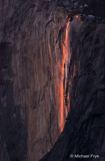 The accompanying photographs were made on Wednesday and Thursday evenings while I was teaching private workshops, and show the current conditions pretty well. On Wednesday some mist drifted past the fall, adding interest, but distant clouds dimmed the light before it reached its most intense color. On Thursday, the light was about as good as it gets for Horsetail, lasting right until the theoretical sunset time, with the cliff behind the fall shaded. If only there was more water!