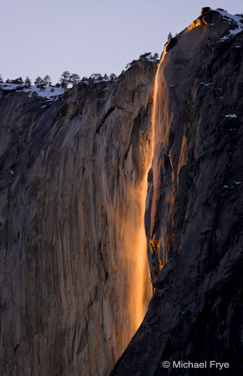 But its rarity makes this event more special. No one who has ever viewed it will ever forget the sight of neon-orange water cascading down a 1500-foot-high cliff. The firefall from Glacier Point may never return, but the unique natural incandescence of Horsetail Fall should be visible for centuries to come.