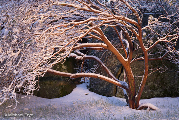Last Saturday night about seven inches of snow fell at my house in Mariposa. At daybreak on Sunday the skies were overcast, but it had stopped snowing, and I decided to try light-painting the beautiful manzanita bush outside my office. I hope the warm lighting in this photograph (below) looks pretty natural, like early-morning sunlight, but it was actually created well before sunrise with a flashlight.