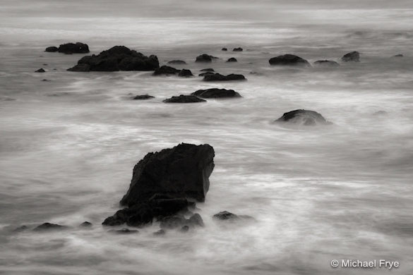 Yesterday morning I drove to a spot along the coast near Trinidad with some interesting rocks and sea stacks. It had stopped raining, but initially the light was flat, and the scene was gray—dark gray rocks against light gray water. I could have just thought, “This won’t work,” and given up. But since I wrote that post about breaking routines a couple of weeks ago I decided to see what I could do with the “wrong” light for the subject. The gray palette suggested composing scenes that would work in black and white, and I thought that slow shutter speeds might transform the scene and create some textural contrasts—hard rocks and soft water. I used a variable neutral density filter to cut the amount of light reaching the sensor, which allowed me to use shutter speeds of six seconds or longer, even after the sun finally broke through. I’ve posted two of these images below.