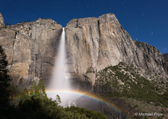 The previous night my friend Jon McCormack and I grunted up the Yosemite Falls trail to a spot with a profile view of the upper fall. I’d photographed a lunar rainbow from this spot in 1996, but back then I didn’t have a wide enough lens on my Mamiya 645 to include Half Dome and the whole waterfall, so I thought it was time to try it again.