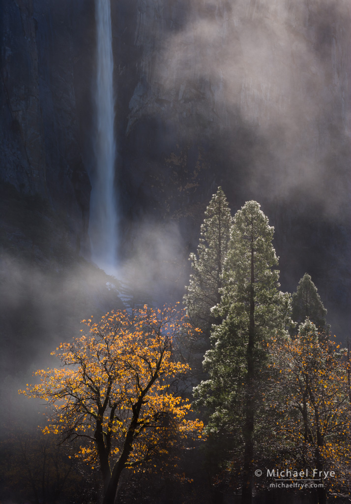 After rising early and photographing a rainbow on Upper Yosemite Fall, then capturing mist rising from trees in El Capitan Meadow, I passed this scene, with beautiful backlight on the oaks and pines underneath Bridalveil Fall. I set up my camera and captured a series of frames as the mist rose from the trees in varying configurations.