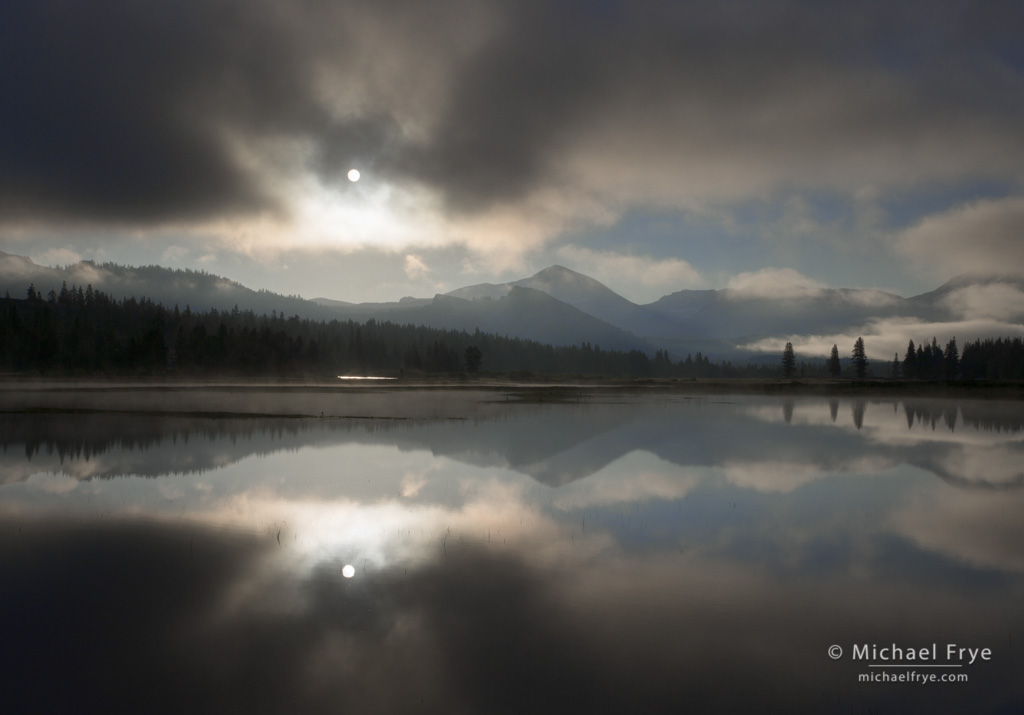 Again, we noticed fog in Tuolumne Meadows on our way to capture the moon setting over Tenaya Lake. After photographing the moonset we returned to Tuolumne, but on that occasion the fog was much thicker. We couldn’t see the sky above us, but the sun had to break through the fog eventually, so we waited.