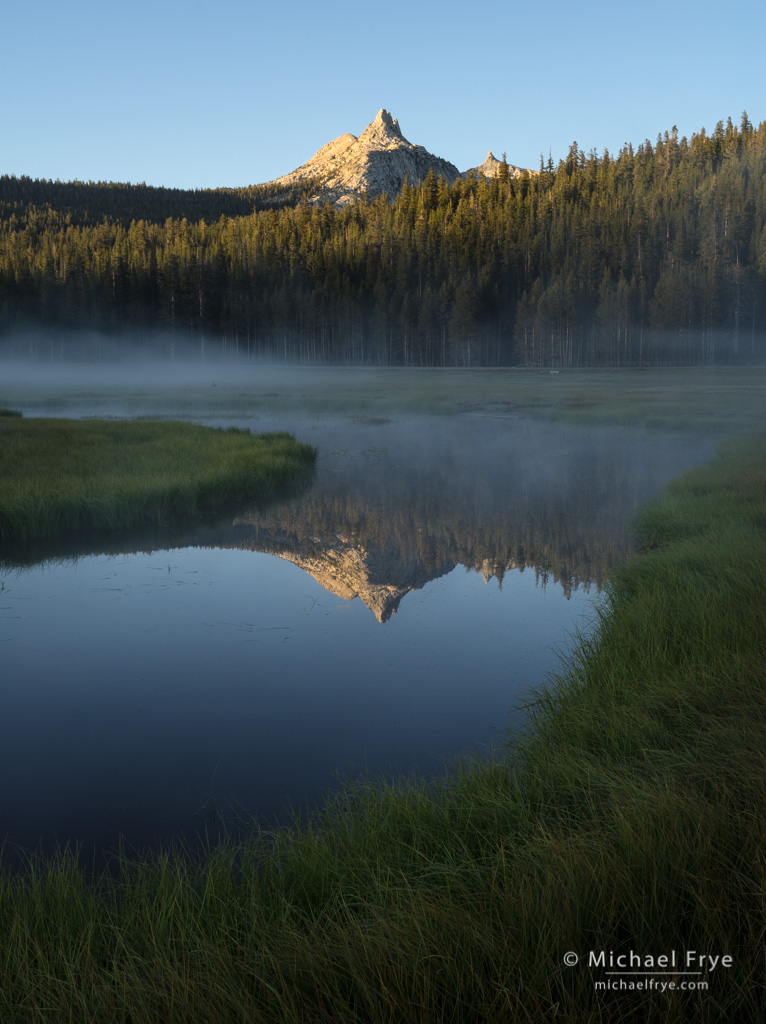 Last Saturday morning, on the last day of my Hidden Yosemite workshop with The Ansel Adams Gallery, we rose early and drove to Tenaya Lake to capture the moon setting over the water. On our way there we noticed low-lying mist in Tuolumne Meadows. We photographed a beautiful moonset over the lake, but as soon as the moon dropped below the ridge we drove back to Tuolumne.