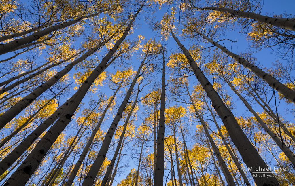 After making the previous photograph (and a few others in the same vicinity), I packed up my camera and started walking back to the car when I noticed how the yellow tops of these aspens were catching the sun, while the trunks below were in the shade. It was quite striking – definitely one of those small-scale lighting events I was looking for. I put on my 24mm lens, looked up, and tried various arrangements before settling on this composition. I wanted to balance the trunks, and luckily found an arrangement where the three most prominent trunks on the left side of the frame roughly mirror the three most prominent trunks on the right side. I also loved the pattern created by the yellow clumps of leaves at the tops of the trees. (1/30th sec. at f/16, ISO 80, 24mm)