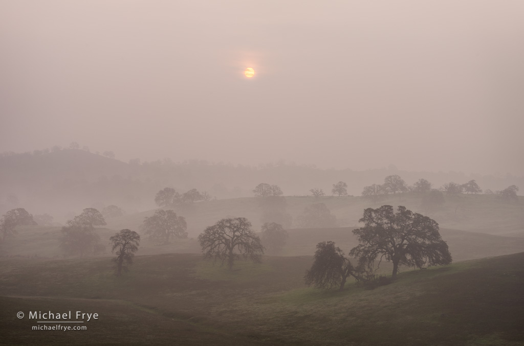 We’ve had a lot of interesting fog around here lately. Last week the fog was very dense in the Central Valley, sometimes persisting all day rather than burning off in the afternoon. One morning we made an early trip into the lower foothills of Mariposa County, an area with rolling, grassy hills and scattered oaks (I’ve posted images from there before). I was hoping that the fog would be thick enough to push up from the Central Valley into these foothills, and it was – just barely. We were right on the edge of the fog, which was actually perfect – foggy enough to create a misty, ethereal mood, but not so foggy that it completely obscured the landscape.