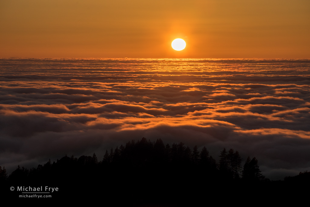 That afternoon the fog was moving in from the Central Valley. On my way up the mountain I drove through a thick layer of fog, then out into the sunshine above, with a sea of fog spreading out to the west. Unfortunately it’s hard to find good western views in this area (it’s mostly private property). But I did find one spot where I could photograph the sun setting over the sea of fog: