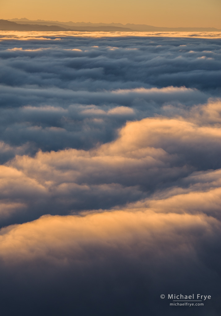 Since then I’ve seen some wonderful images of the Golden Gate Bridge poking up through fog, and other photographs with a similar theme from the Bay Area, and other spots. Last summer I got a chance to look down on fog at the mouth of the Klamath River, and made a couple of photographs that I really liked, but that wasn’t really the sea of fog that I remember seeing long ago in the Bay Area.