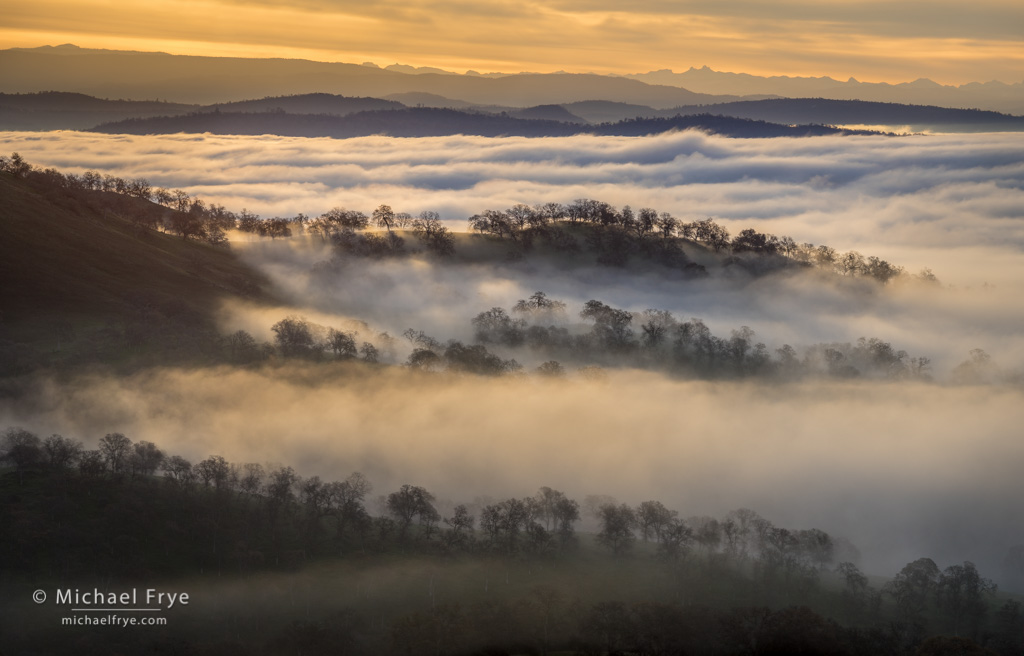 Telephoto lenses also compress space, which helped create layered patterns out of ridges and bands of fog that were many miles apart. And in some of these images, the longer focal lengths helped to bring in the distant peaks of the southern Sierra, and make them look big enough to become part of the composition and the story.