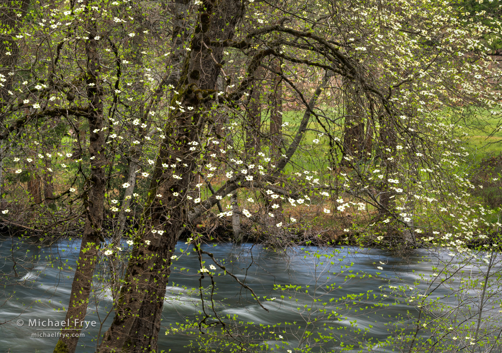 It didn’t clear after all. In fact it rained most of the time I was there, with the rain turning to snow in heavier showers. But rumors of dogwoods blooming turned out to be true. I found one particularly full dogwood along the Merced River, and was able to photograph it during a break between rain squalls (above).