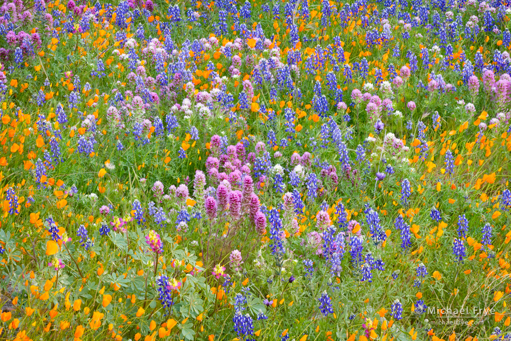 The next two photographs both include multi-colored patterns of flowers. In the first image, a clump of owl’s clover just below and left of center provides a subtle but important focal point. It’s the color that draws attention to this spot, and from there your eyes can roam around the rest of the frame. In fact the flowers seem to form faint concentric rings around that focal point.