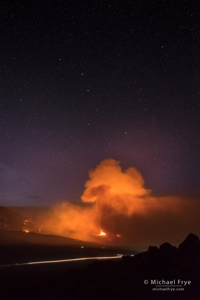Sunday afternoon the winds picked up, and the fire become more active. That evening I photographed the fire from nearby vantage points to the south, and it was spectacular. Late in the evening it looked like firefighters performed a firing operation (a back burn) near Highway 395, which caused the fire to flare up again.