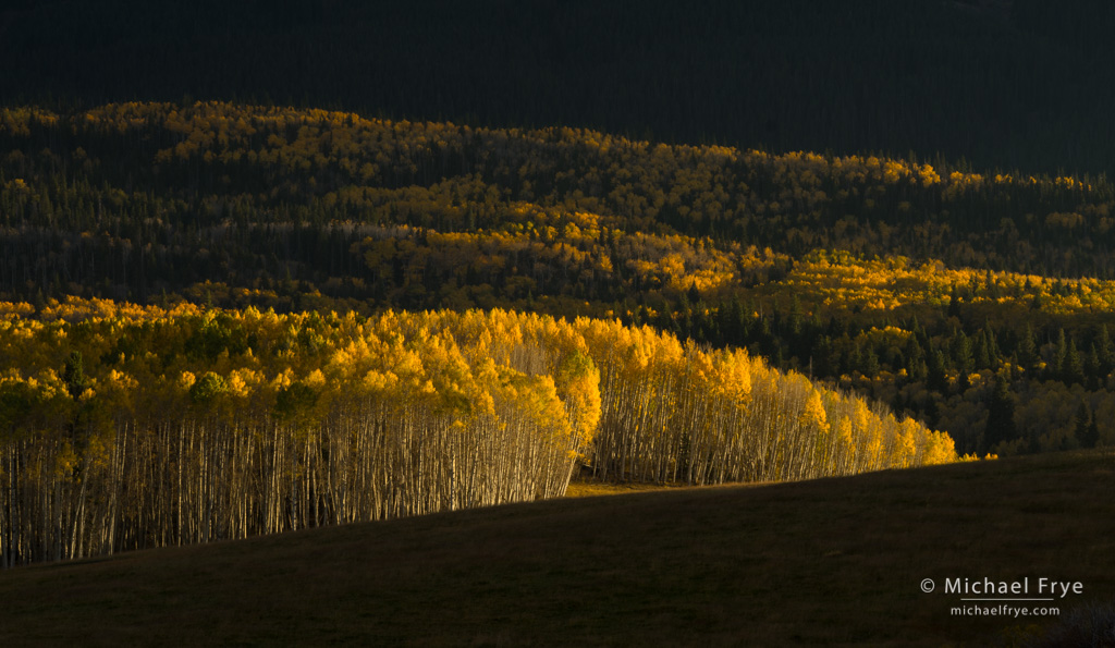 Aspen-covered hillsides, Uncompahgre NF, Colorado. Clouds created beautiful dappled light on these hillsides, but required patience to wait for the sun to hit the right spots.
