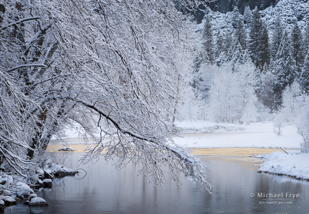 Snow-covered alder branches hanging over the Merced River, Yosemite. This photograph is a distillation of ideas from the previous image, filling the frame with delicate alder branches, golden reflections, and nothing else. It’s clean and simple, but more abstract.