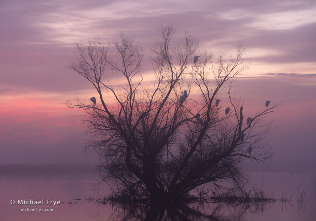 Great egrets roosting in a willow at sunrise, San Joaquin Valley. We stumbled upon this tree where a group of egrets had spent the night. This was another sunrise with a thin layer of fog, and high clouds lighting up behind them.