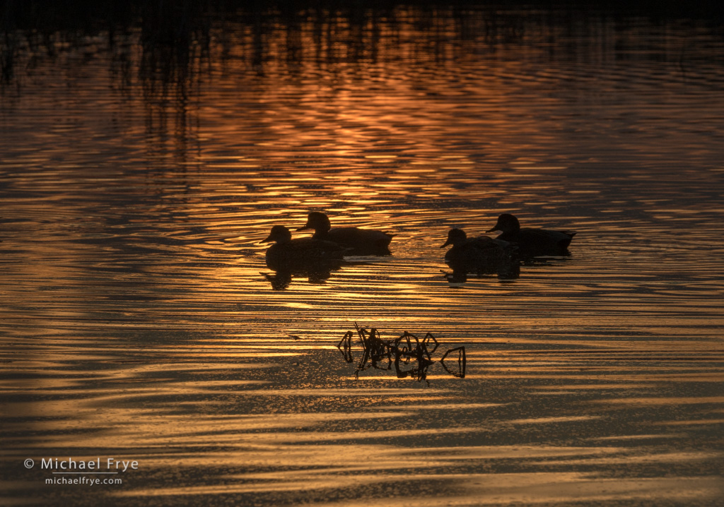 American wigeons at sunset, San Joaquin Valley. A brilliant sunset reflected in a pond where these ducks were feeding. The hardest part was getting the ducks to pull their heads out of the water and all face the same direction.