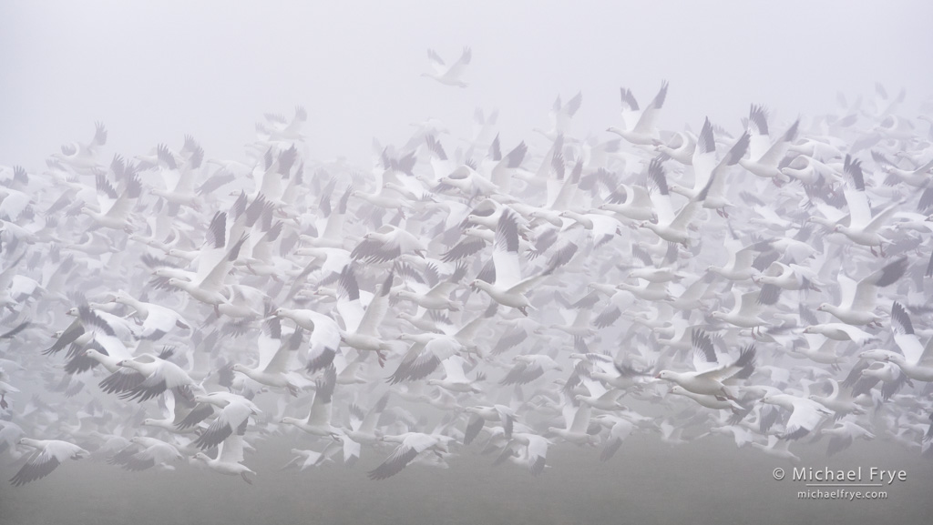 Claudia and I have made several trips to California’s Central Valley this winter to photograph birds. It’s one of our favorite things to do this time of year, when large flocks of waterfowl take up residence in the valley’s marshes for a few months before migrating northward in the spring. I love watching and photographing the movements of these flocks, especially the white geese – the snow geese and Ross’s geese. Seeing 10,000 geese take off in a single, noisy, coordinated wave is simply awe-inspiring, but there’s magic and beauty in their smaller comings and goings as well.