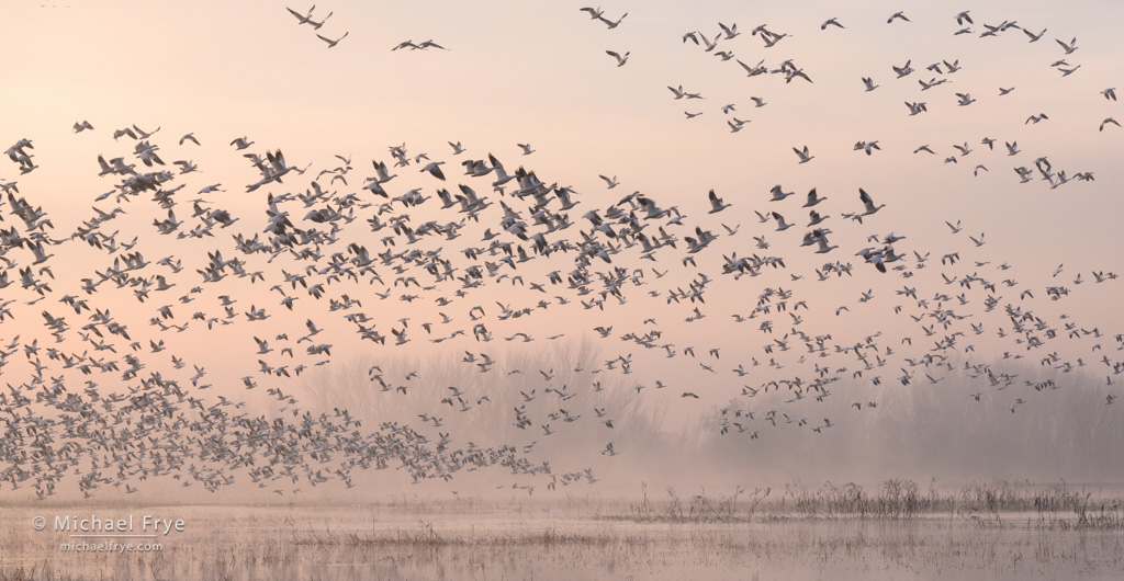 Ross’s geese taking flight at sunrise, San Joaquin Valley. This was captured about ten minutes after the photograph at the top of the post, as the last group of geese took off in one large wave.