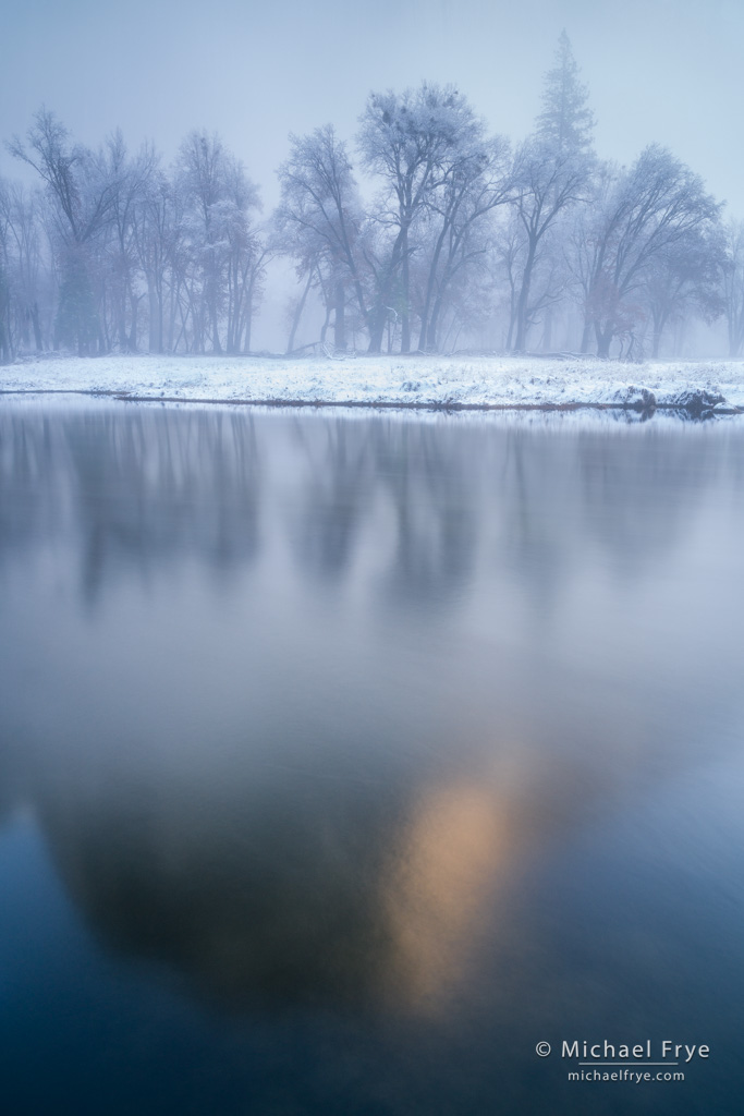 Friday’s storm got cold enough to drop a couple of inches of snow on Yosemite Valley. The storm cleared during the night, but showers lingered until the wee hours Saturday morning. It seemed possible that we might find some mist at sunrise, so Claudia and I drove up early to Yosemite Valley.
