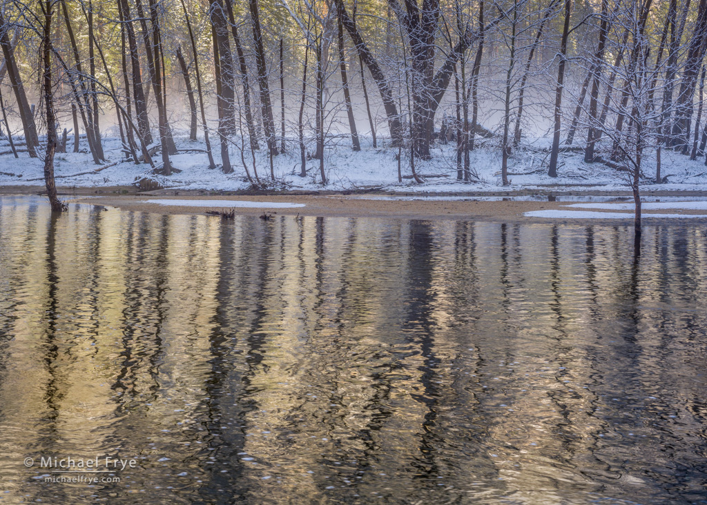 Once the mist dissipated in El Cap Meadow we headed to Swinging Bridge, further up the valley along the Merced River. The sun was just about to reach this spot, and there was still a little bit of mist in Leidig Meadow across the river. We found some beautiful reflections in the still-shaded river, and the high water hid most of the sandbars that are usually visible in that area, creating opportunities to photograph reflections of cottonwood trees, as in the last photo below.
