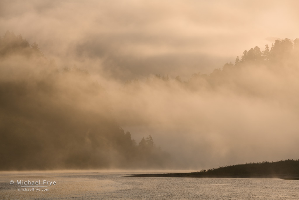 Fog helps to convey that primeval mood, and luckily fog is pretty common around here. If you don’t get coastal fog you can sometimes find valley fog or river fog. The photographs here are from two different mornings along the Klamath River. For the image above I looked toward the sun as it was breaking through the fog, and stacked seven- and four-stop neutral-density filters together to get a slow enough shutter speed (eight seconds) to smooth the water and blur the fast-moving clouds. For the photograph below I left the filters off and used a fast shutter speed, as I was just trying to catch fleeting moments of light and mist.