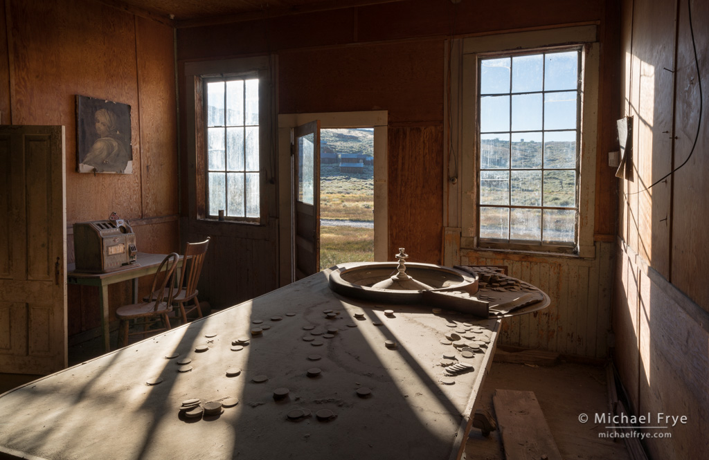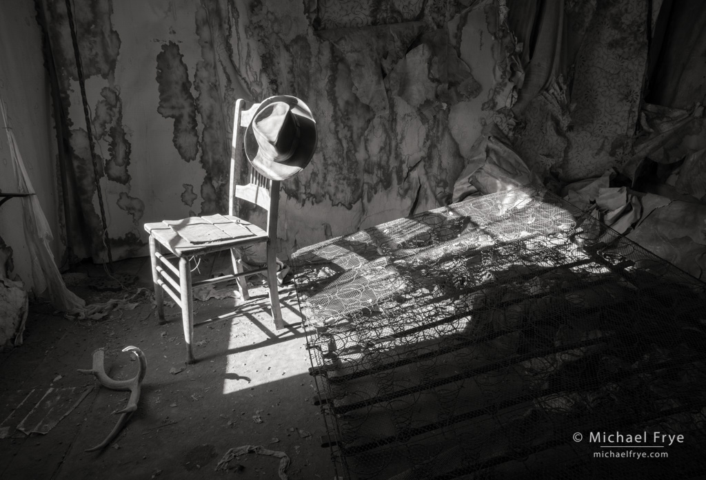 But sunlight can work too. In the morning the sun streams in through the many unshaded, east-facing windows in Bodie, throwing random spotlights into the rooms. These scenes can have extreme contrast, so bracketing and blending exposures is often required. But the main ingredient is that the sun has to hit something interesting, something you can build a composition around. If your main subject is lit by the sun, surrounded by darker areas, then the viewer’s eye will be drawn to that subject. If your main subject or focal point is in the shade, with sunlit areas next to it or behind it, that’s a problem, because you’ve created a visual tug of war between what you want people to look at – your subject – and what their eye is naturally drawn to – the brightest parts of the photograph. In these images I tried to use sunlight to draw the viewer’s eye to key parts of the scene: