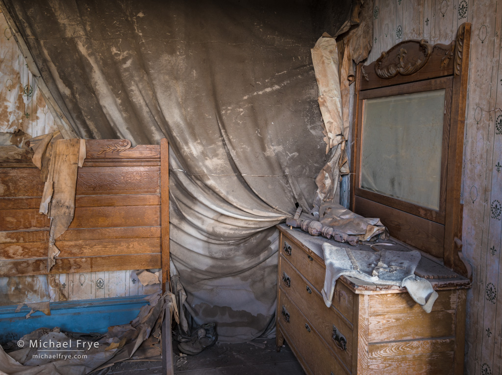 Bedroom in the morgue, Bodie State Historic Park, California. More window light, but this time coming mainly from behind the camera. This soft frontlight didn’t emphasize textures as much, but did help to bring out the beautiful subtle colors in this room.