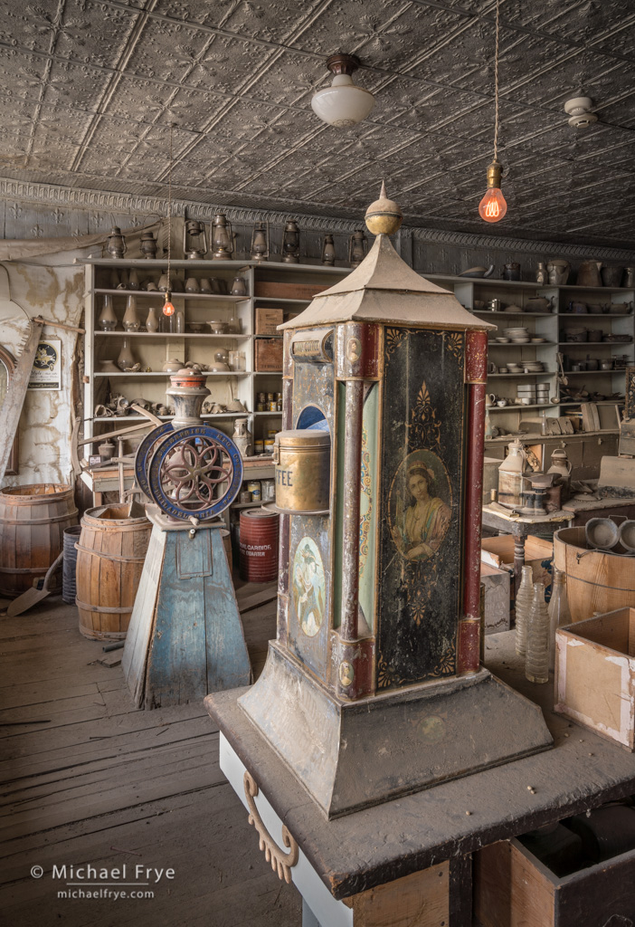 Boone General Store, Bodie State Historic Park, California. The coffee bin on the right is the main focal point. The coffee grinder on the left provides a repeating echo, plus there are other repeating patterns in the shelves and ceiling. Soft window light from the left created perfect illumination for a scene like this.