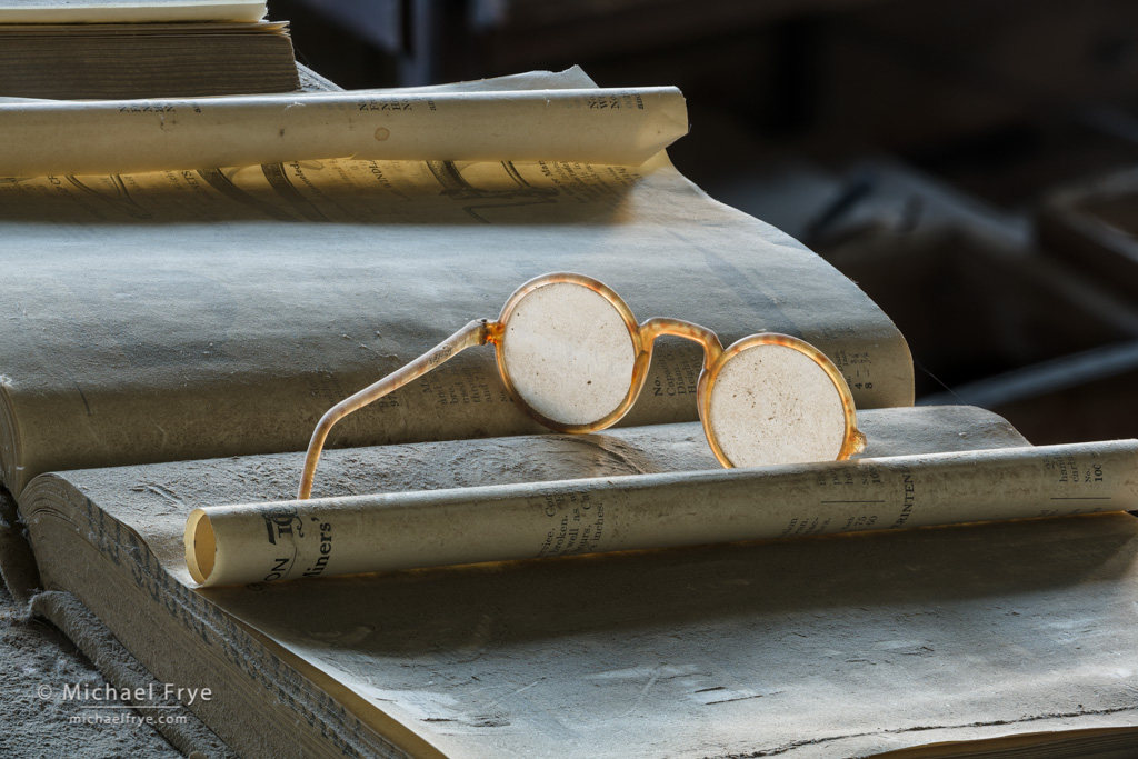 Eyeglasses, Boone General Store, Bodie State Historic Park, California. Here window light was coming from behind the subject, creating a soft, backlit translucence along the rims of the glasses and through the curled pages. There’s a clear and obvious focal point.