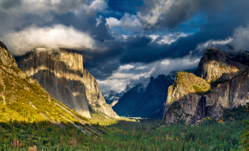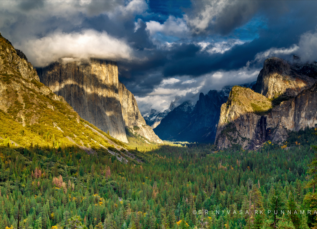 Srinivasa was lucky to catch some dramatic weather at Yosemite’s most iconic location, Tunnel View. There were plenty of interesting clouds overhead, and some nice mottled patterns of light and dark on the cliffs – especially the striped bands on El Capitan to the left.