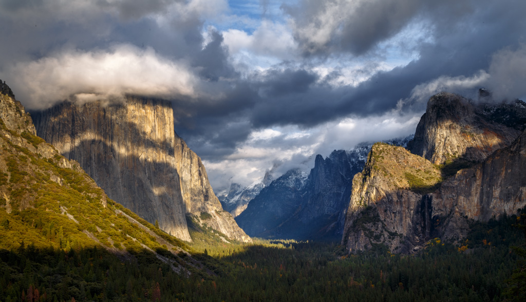 It would have been great to have some sunlight hitting Bridalveil Fall also (even though there wasn’t much water in it), and maybe even some spots of light on the valley floor in the foreground. But this photo was taken late on a November afternoon, and by that time of day at that time of year the light had already left Bridalveil and the foreground. In other words, even on a sunny, cloudless day those areas would have already been in the shade.