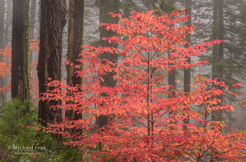 Dogwoods and firs in the fog, autumn, Yosemite, Monday afternoon along Highway 120
