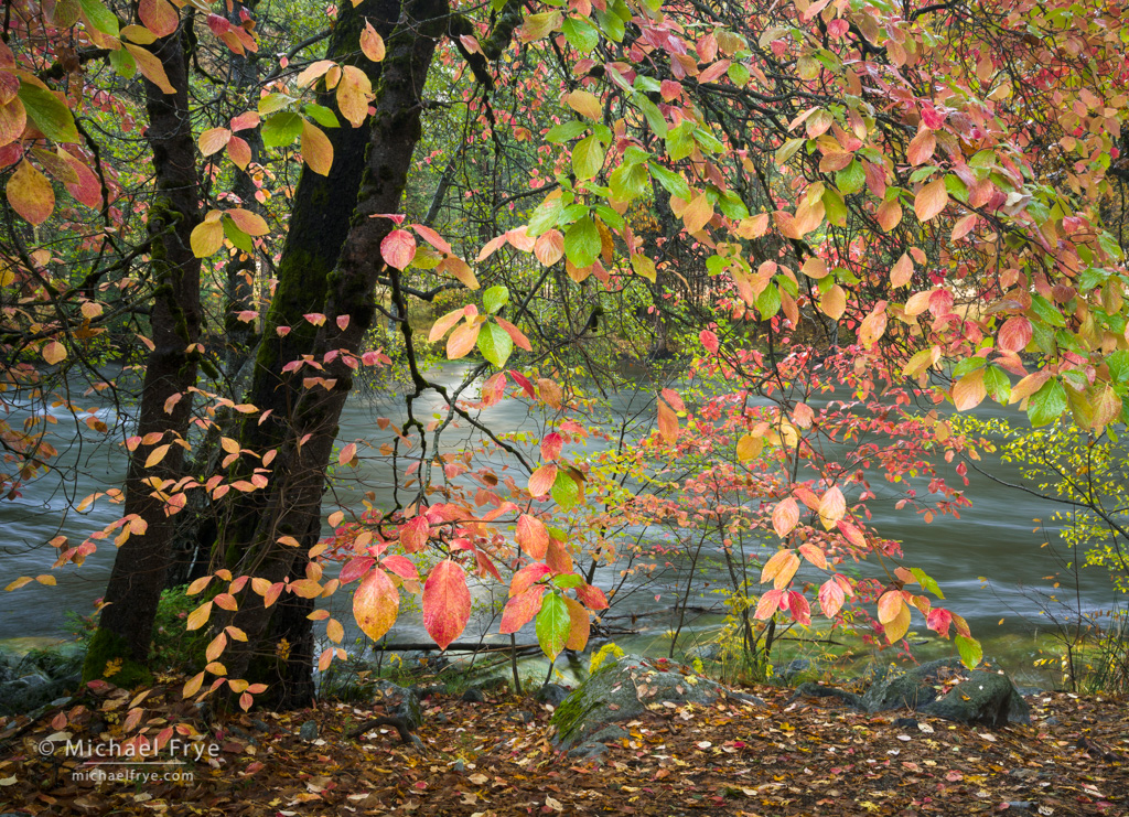 Dogwoods and the Merced River in autumn, Yosemite, Monday morning