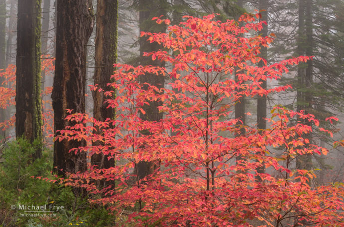 Overall the color in Yosemite Valley looked great. Some big-leaf maples had lost their leaves, but most were vibrant yellow and near their peak. The cottonwoods produce the most variable and inconsistent autumn display of the deciduous trees in the valley, but it seems to be a good year for them, and a majority of them were yellow. The valley dogwoods were at least half green, so they won’t peak for another week or so, but some were quite colorful. The one valley deciduous tree species that seems to be having a poor year is the black oaks. About half of them have turned brown, while the other half have their usual golden-yellow autumn leaves and are near peak. It’s been a good year for the higher-elevation dogwoods, with many of them displaying vivid reds along highways 120 and 41. But they’re starting to lose their leaves, so they won’t last long.