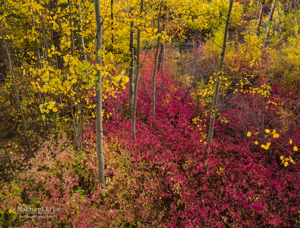Aspens and dogwoods, autumn, Inyo NF, October 14th. I climbed onto a boulder to get this high vantage point, allowing me to point the camera down into the forest to show the colorful understory. The focal length was 26mm.