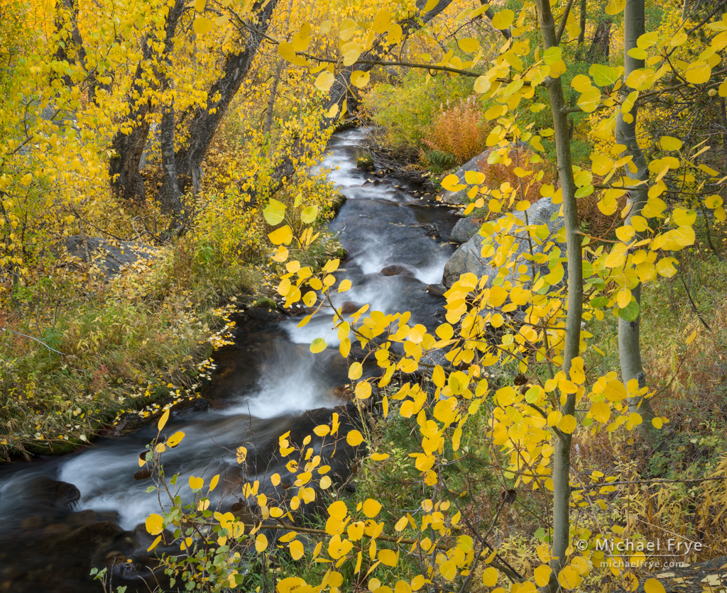 Autumn colors along Bishop Creek, Inyo NF, October 1st. Another elevated perch – this time on a rock – helped reveal the s-curve in the creek, and allowed me to point the camera down and keep the sky out of the frame. The focal length was 35mm.
