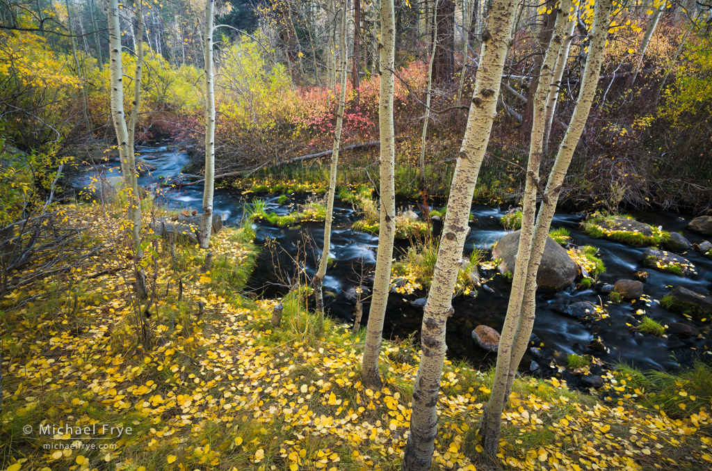 Autumn scene along an eastern Sierra creek, Inyo NF, October 18th. This camera position was slightly elevated, as the ground sloped more steeply up from the creek than it looks in the photo. The wide-angle lens (18mm) allowed me to include the curving line of the creek, which helped to convey a sense of depth.