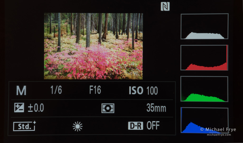 Notice that the luminance histogram (at the top in this illustration) looks fine, with nothing pushed against either edge. You wouldn’t see any blinkies here, because the blinkies are based on that luminance histogram. But the red channel has a big spike at the right edge, showing that it’s overexposed. Overexposed reds and yellows are usually very difficult to work with later, even in Raw files. No matter what you do they end up looking weird and splotchy or posterized. So if the red channel is clipped you need to make a darker exposure. Keep going darker until you don’t see any clipping in the red channel. Or you can bracket and blend the exposures together later – just make sure at least one of your bracketed exposures shows no clipping in the red channel.