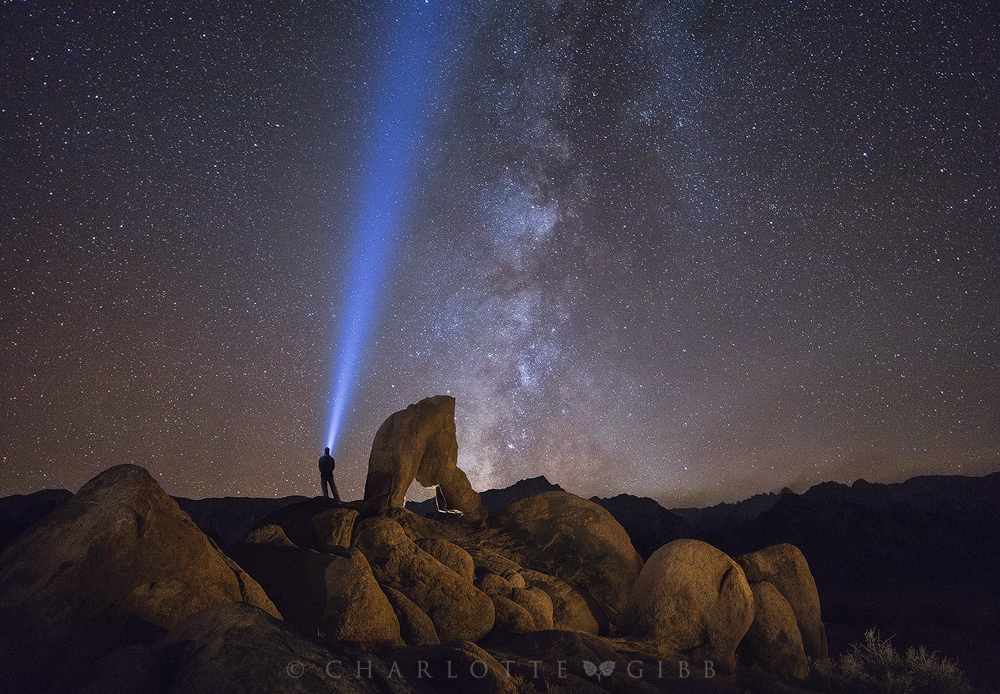 Next I asked if anyone had any other lighting ideas. And Charlotte Gibb, one of my assistants, asked if I could go behind the arch and point my flashlight up. We had tried this previously (at Charlotte’s suggestion) in the Trona Pinnacles, and it added an interesting element to the scene, so it seemed worth trying again. Luckily, as we had discovered, one of my flashlights created a beautiful blue beam when pointed up toward the sky. I tried this from several different positions behind the arch, and then stood next to the arch and put myself in the picture.