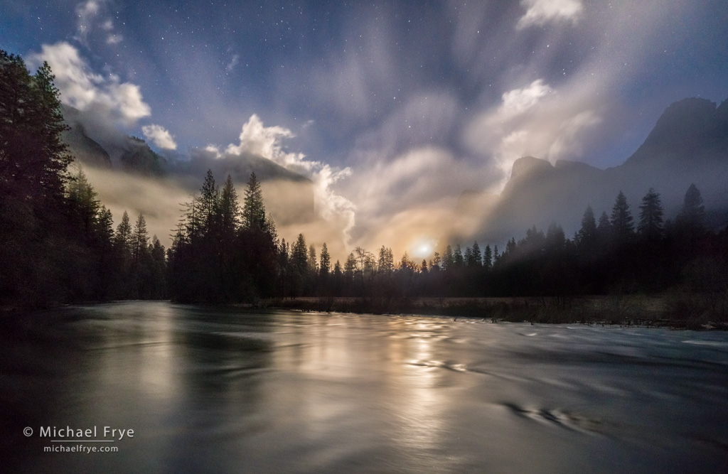 47. Moonlit winter night with Half Dome, Glacier Point, and the Merced River, Yosemite NP, CA, USA