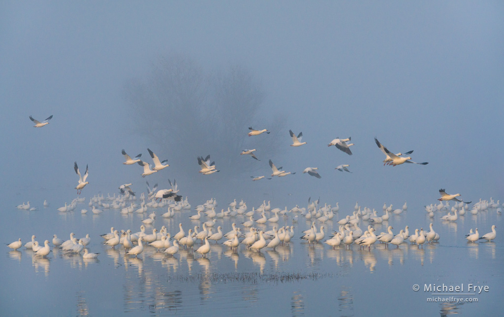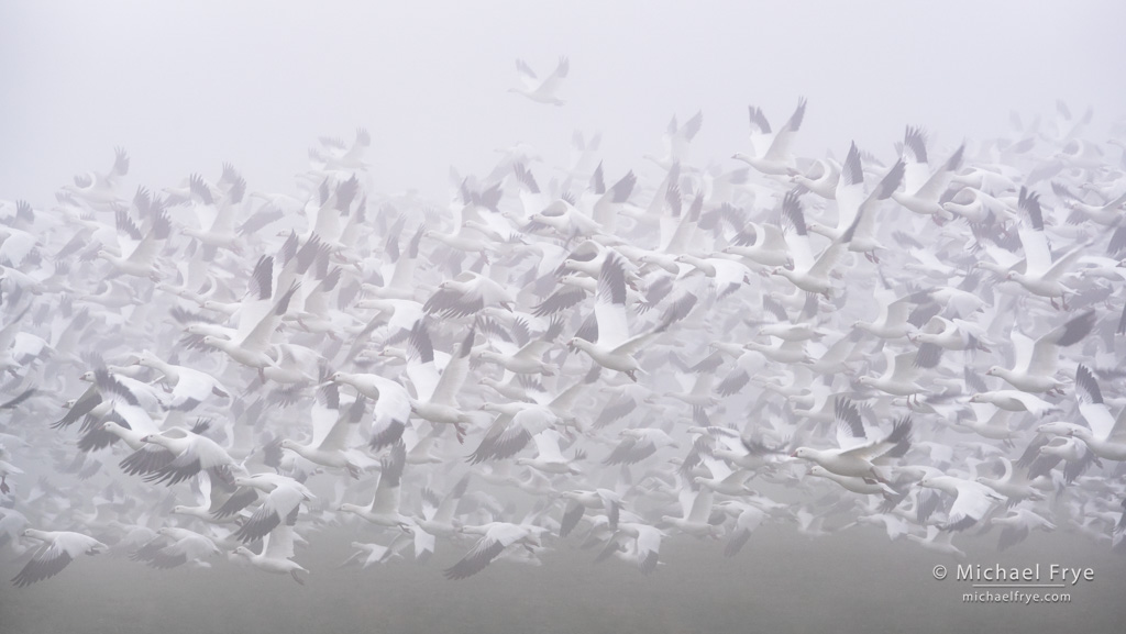 6. Ross’s geese taking flight in fog, San Joaquin Valley, CA, USA