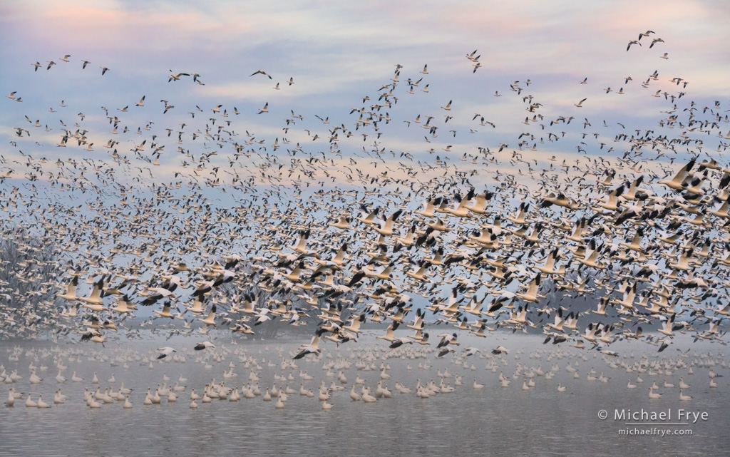 12. Ross’s geese lifting off at sunrise, San Joaquin Valley, CA, USA