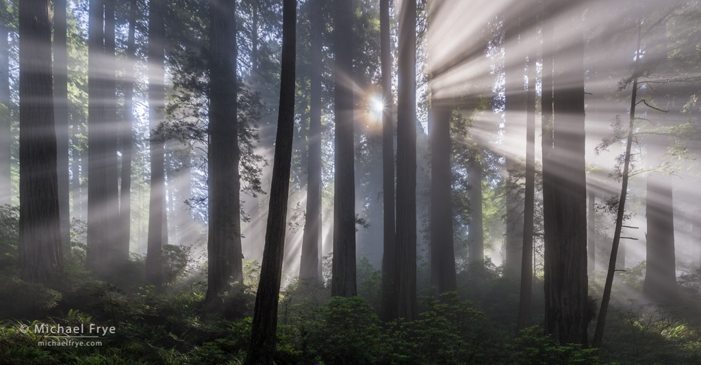 24. Sunbeams in a redwood forest along the northern California coast, USA