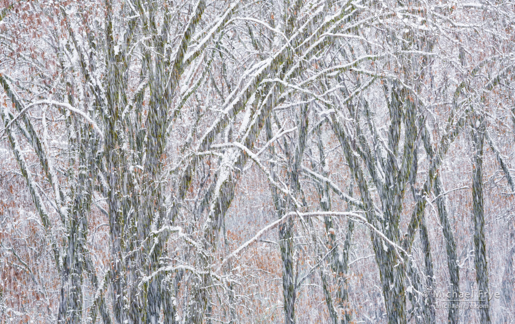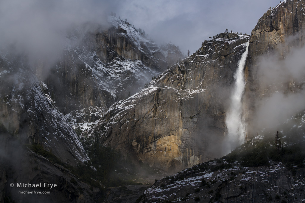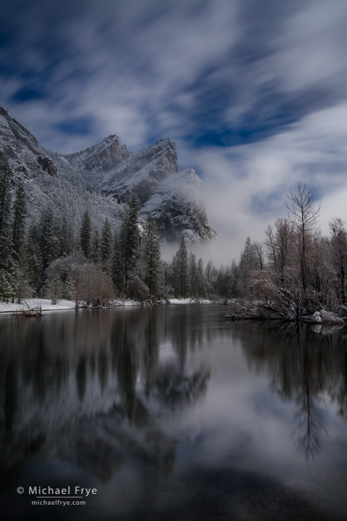 It snowed on Tuesday in Yosemite Valley, then turned to rain on Wednesday, and back to snow on Thursday. We had some clearing-storm conditions Wednesday morning, and a moonlit clearing storm on Thursday evening. Thursday’s snow stuck to the trees for an unusually long time in shady areas, and we found mist along the river and meadows on Friday and Saturday evenings. All in all it was a great five days, which made all the scheduling uncertainty worthwhile.