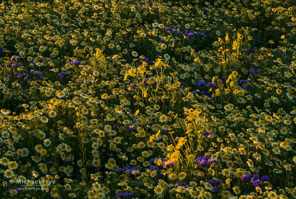 Hillside daisies, tidytips, and valley phacelia in late-afternoon light, Carrizo Plain National Monument. I rarely photograph flowers with sidelight, but these sidelit hillside daisies caught my eye, poking up out of a sea of tidytips and phacelia, catching the late-afternoon sun. 106mm, 1/4 second at f/16, 100 ISO, focus-stacked.